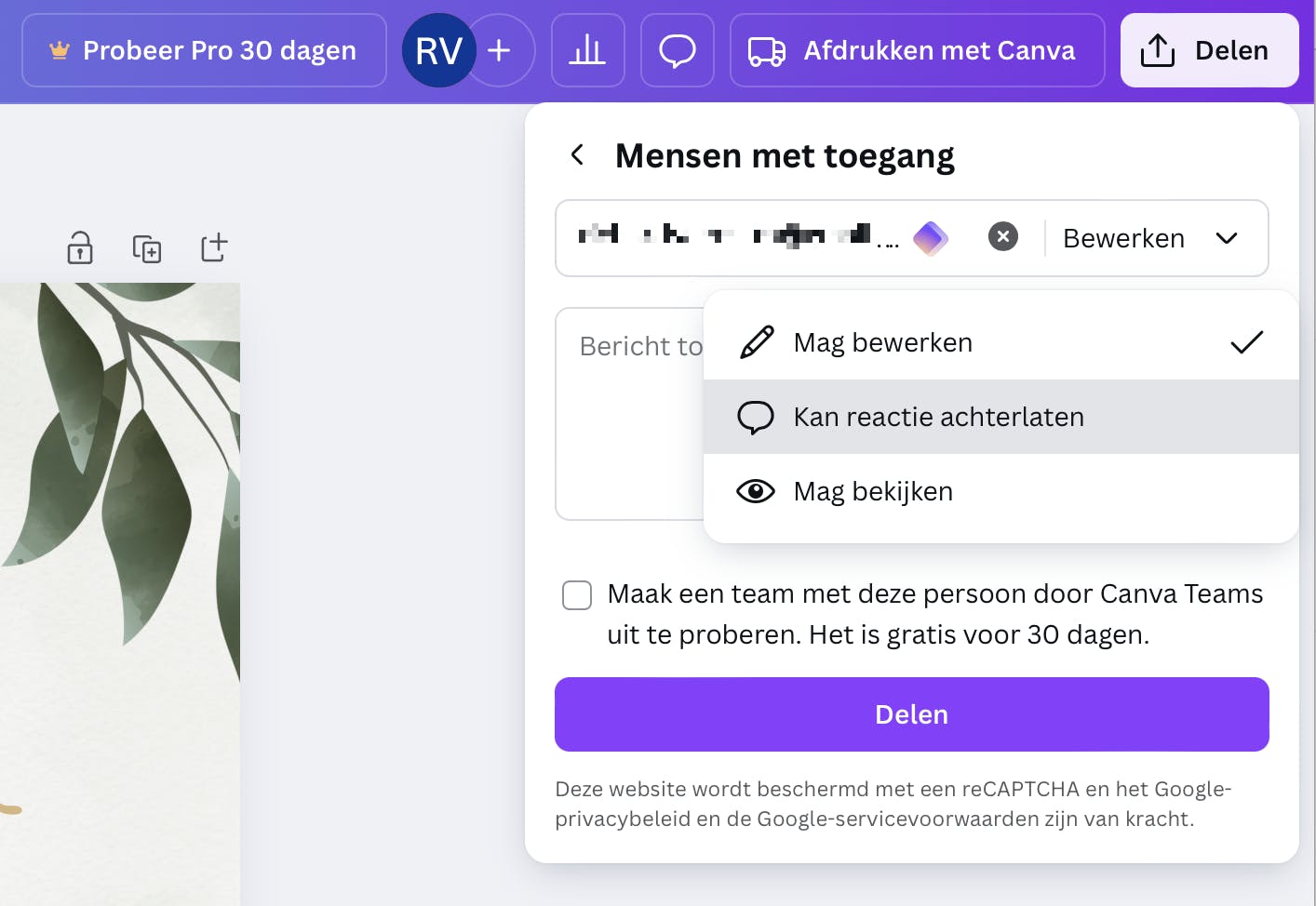 In Canva is het heel makkelijk om samen aan documenten te werken, de andere persoon moet wel een Canva-account hebben. Klik op Delen en voeg onder Mensen met toegang het e-mailadres toe van diegene die aan het document mag werken. Als je een adres hebt aangegeven, kun je erachter kiezen of diegene alleen Mag bekijken of ook Mag bewerken. Een andere optie is dat een persoon alleen reacties mag achterlaten. In dit geval kies je voor Kan reactie achterlaten. Deze laatste optie is handig als je iemand wel om zijn mening wilt vragen, maar deze persoon het design of de inhoud niet kan veranderen.