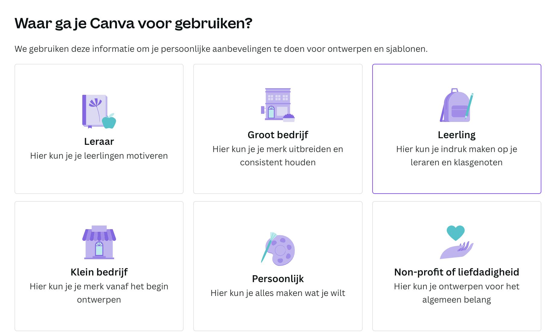 Bij het aanmelden voor Canva kies je hoe je Canva wilt gebruiken. Dit heeft geen invloed op de functies die Canva biedt.
