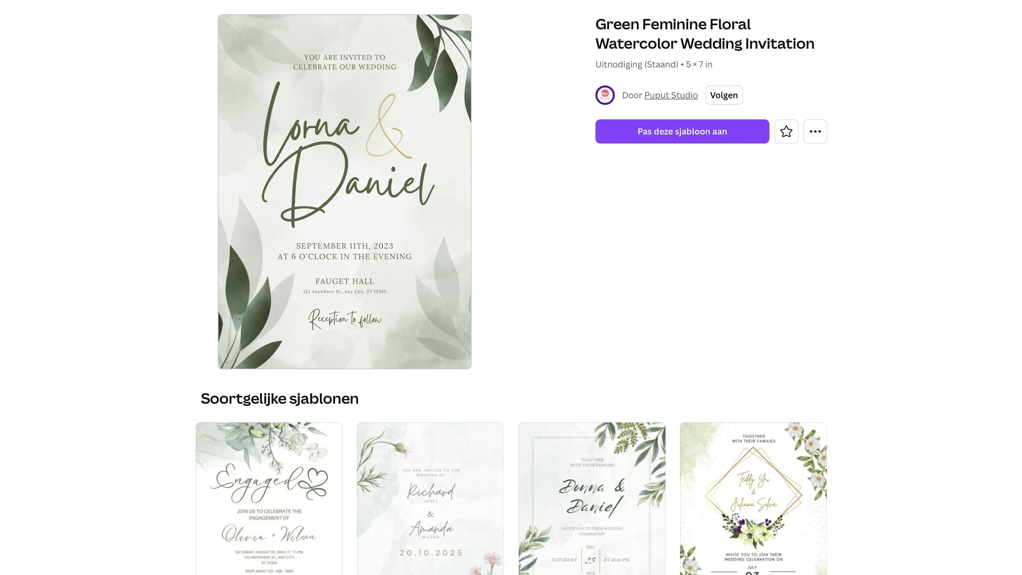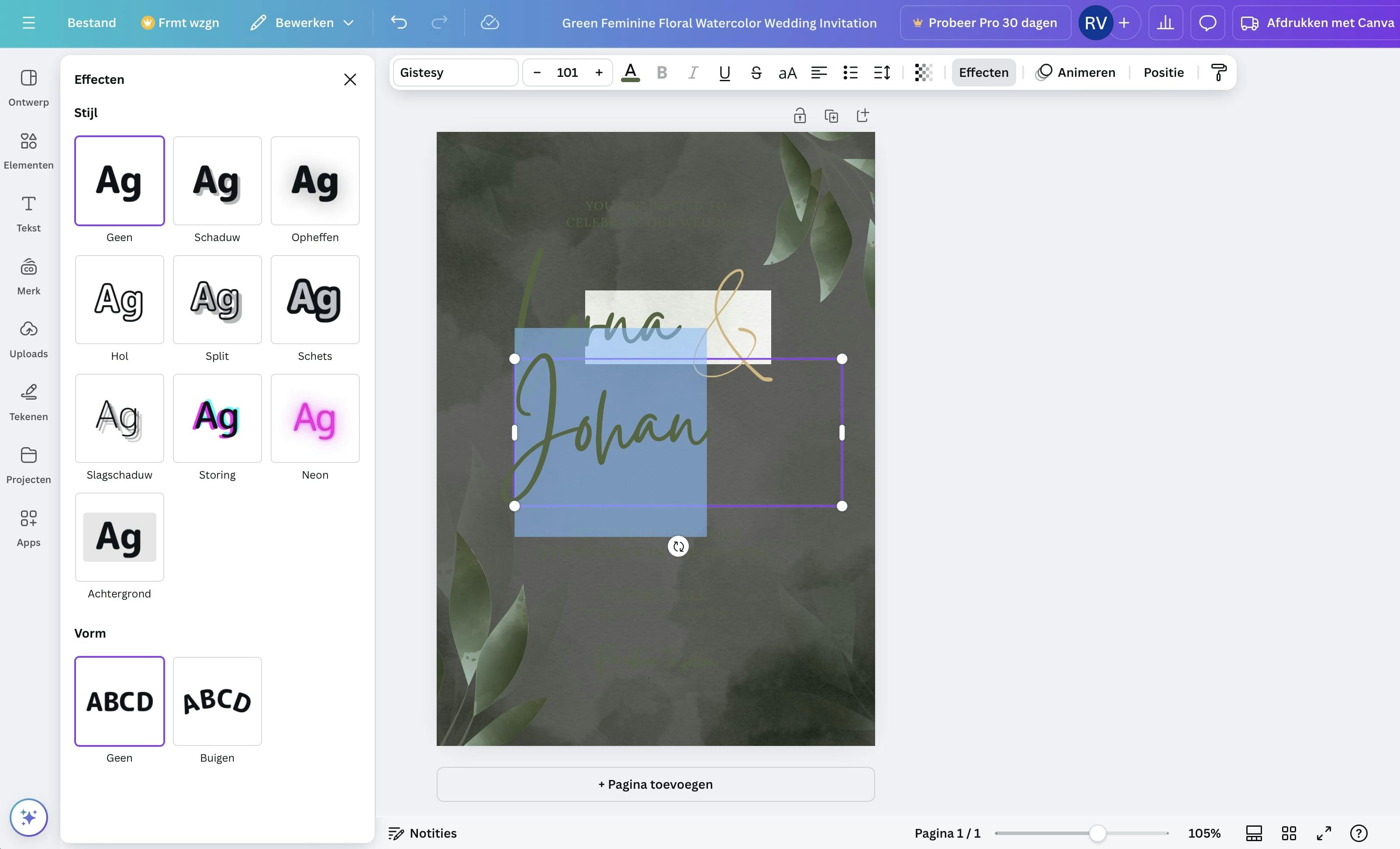 Klik op Pas deze sjabloon aan om het voorbeeld te openen. Laten we eerst de sjabloonteksten aanpassen. Zodra je met je muis over een tekst gaat, zie je het tekstvak oplichten met een paarse rand. Dubbelklik op de tekst en gebruik je toetsenbord om de tekst in dit tekstvak te wijzigen. Wil je de eigenschappen van de tekst wijzigen, dan doe je dit boven in het menu. Verander bijvoorbeeld het lettertype, de tekengrootte, kleur of uitlijning van de tekst in het tekstvak. Als je op Effecten klikt, dan wordt er een menu aan de linkerkant geopend waar je verschillende soorten schaduwen of andere teksteffecten kunt selecteren. Ook de vorm of een eventuele achtergrond van de tekst is hier te wijzigen. Denk er wel aan dat je het design van het sjabloon hier wel mee kunt verstoren, ga dus spaarzaam om met teksteffecten. Zelf een tekstvak toevoegen kan uiteraard ook. Klik op Tekst en kies voor Voeg een tekstvak toe. Klik links op één van de tekststijlen of pas alle instellingen aan door bovenin het lettertype, de kleur of stijl te wijzigen. Links kun je onder Lettertypecombinaties ook een vooringestelde letter- en vormgevingscombinatie kiezen.