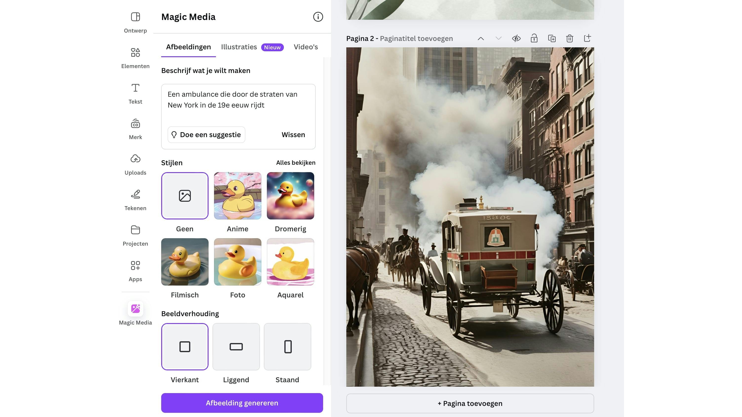 Er zitten nog veel meer AI-opties in Canva. Zo is het mogelijk om afbeeldingen te genereren op basis van tekstomschrijvingen, iets wat je wellicht al kent van andere AI-afbeeldingsgeneratoren zoals Dall-E. Klik op Elementen en kies voor Genereer je eigen plaatje onder AI-afbeeldinggenerator. Voeg een zo duidelijk mogelijke ‘prompt’ in en kies één van de stijlen eronder. Onder Beeldverhouding kies je de vorm van het te genereren plaatje. Kies vervolgens voor Afbeelding genereren. Onderaan zie je hoeveel credits je nog over hebt. Met de gratis versie heb je vijftig credits om de dienst uit te proberen, daarna moet je een betaald abonnement nemen. Naast afbeeldingen kun je dezelfde AI-optie ook voor illustraties gebruiken. Hiervoor klik je bovenin op Illustraties. Nog interessanter wordt het als je weet dat je ook video’s kunt genereren op deze manier. Deze optie zie je als je op Video’s klikt. Voor video’s heb je overigens maar vijf credits en deze optie is nog in de bètafase.