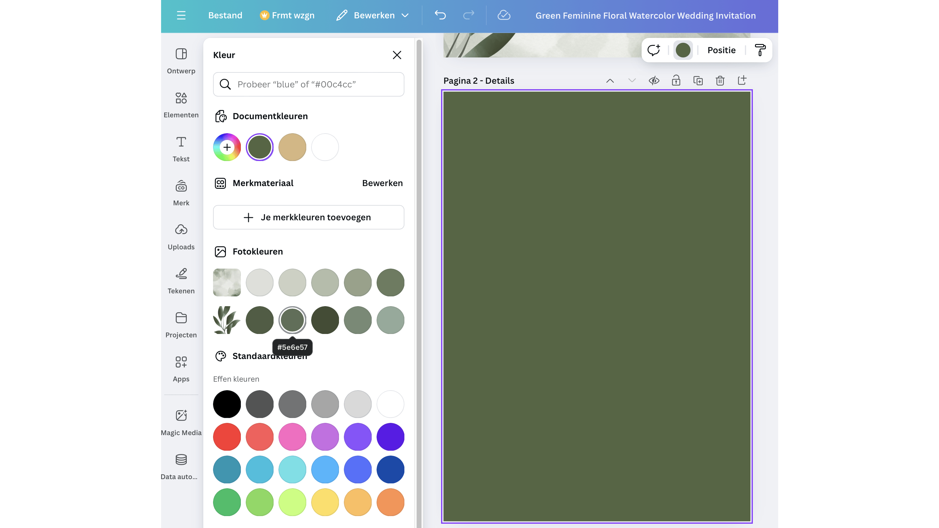 Een document hoeft natuurlijk niet maar één pagina te bevatten. Door onderaan op + Pagina toevoegen te klikken, wordt er een pagina aan je document toegevoegd. Dit is dan een lege pagina zonder opmaak. Bovenin heb je de mogelijkheid om de achtergrond van je pagina aan te passen. Klik hiervoor op het kleuren-pictogram. Naast standaardkleuren kun je onder Fotokleuren kleuren kiezen die Canva uit elementen van je eerste pagina haalt.