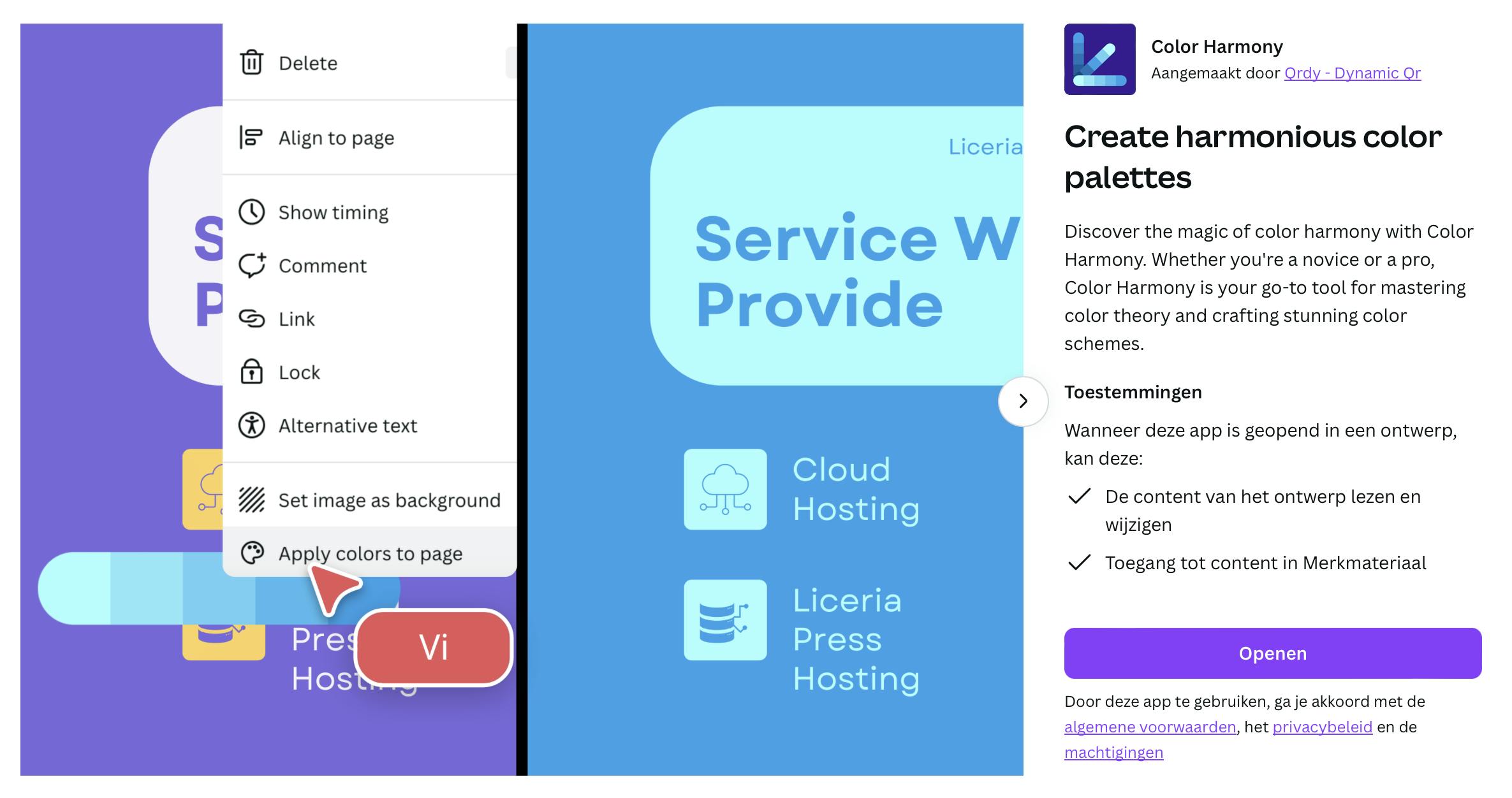 Het is onmogelijk om alle functies in Canva te behandelen, maar één optie willen we je niet onthouden en dat is de mogelijkheid om apps binnen Canva te draaien. Klik links op Apps en je ziet tientallen apps weergegeven. Klik op een app om meer informatie te ontdekken over een app en kies voor Openen om de app binnen Canva te gebruiken. Zo zijn er apps om je te helpen bij het vinden van goede kleurcombinaties, kun je verscheidene fotobewerkings-apps binnen Canva draaien en zijn er apps om logo’s mee te creëren.