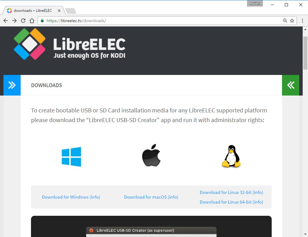 De installatie van LibreELEC voer je uit vanaf een opstartbare usb-stick of sd-kaart. Kijk dus eerst even welke aansluitingen er op de (toekomstige) mediaspeler beschikbaar zijn. LibreELEC stelt een programma beschikbaar waarmee je eenvoudig een opstartbare usb-stick of sd-kaart creëert. Surf hiernaartoe en klik bovenaan op een link om LibreELEC USB-SD Creator te downloaden. Dit programma is voor Windows, macOS en Linux beschikbaar. In Windows dubbelklik je op het exe-bestand, waarna het programma direct opstart.
