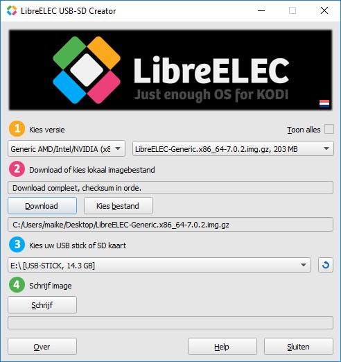 Prik een usb-stick of sd-kaart in de computer. Houd er rekening mee dat LibreELEC USB-SD Creator alle gegevens op dit opslagmedium wist. Belangrijk is dat je bij Kies versie voor jouw hardware de juiste keuze maakt. Voor gebruik van een reguliere (mini-)pc of laptop kies je de optie Generic AMD/Intel/NVIDIA (x86_64) om een opstartbare usb-stick aan te maken. Verder kun je je onder meer een opstartbaar opslagmedium voor Raspberry Pi en Odroid creëren. Maak een keuze en klik bij de tweede stap op Download. Je bladert naar de gewenste opslagmap, waarna je bevestigt met Map selecteren. Bij de derde stap wijs je de juiste usb-stick of sd-kaart aan. Kies als laatste voor Schrijf / Ja.