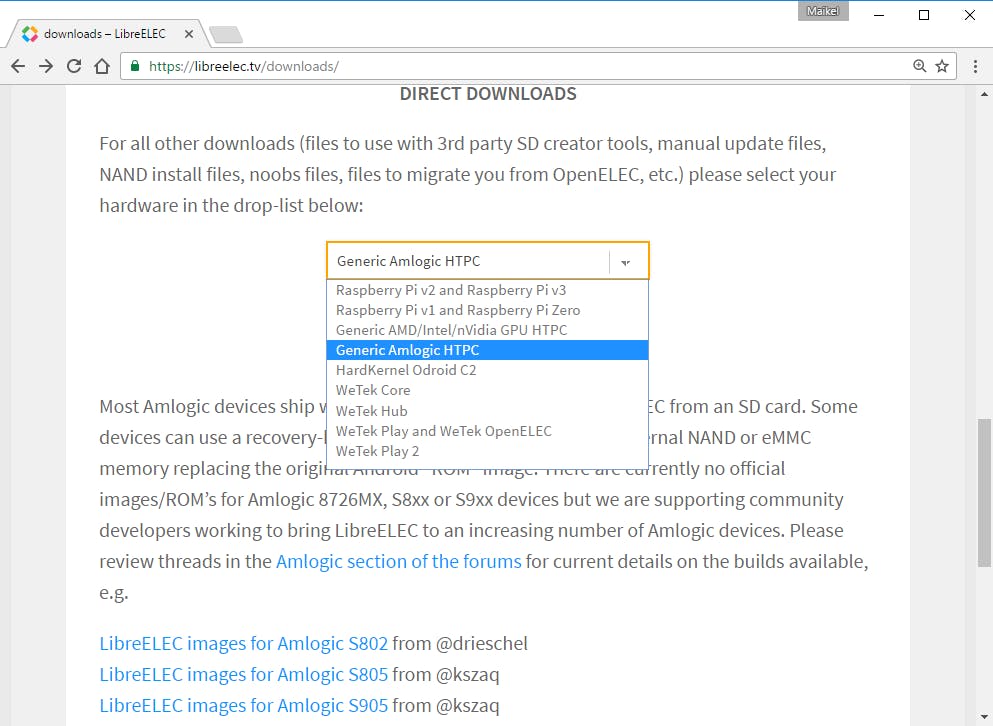 Veel Android-boxen draaien op een chipset van Amlogic. Indien je ontevreden bent over je mediaspeler, gebruik je eventueel LibreELEC vanaf een sd-kaart of het interne opslaggeheugen. LibreELEC stelt zelf geen officiële versies voor Amlogic-chipsets beschikbaar, maar diverse forumleden hebben aangepaste versies ontwikkeld. Voor spelers met een Amlogic S802, S805 of S905 vind je hier de juiste downloadlinks. Kies bij het onderdeel DIRECT DOWNLOADS voor Generic Amlogic HTPC. De installatie verschilt per apparaat en is alleen bestemd voor gevorderde gebruikers.
