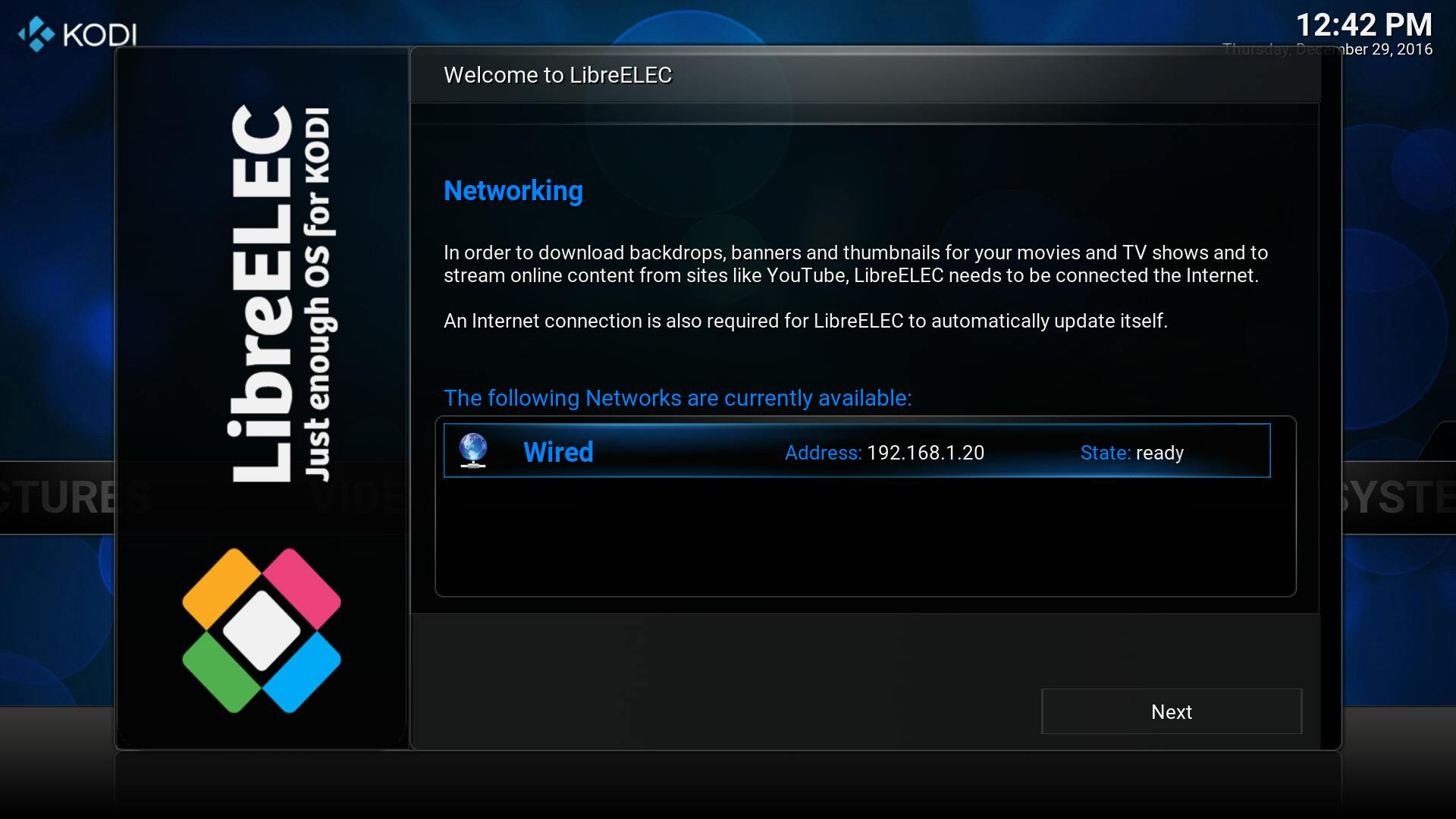 Zodra je je eigengemaakte mediaspeler voor de eerste keer opstart, verschijnt er een welkomstvenster. Kies voor Next en bedenk onder Hostname een relevante naam voor je mediaspeler. Onder deze naam verschijnt het apparaat namelijk in je netwerk. In het volgende scherm neem je de netwerkinstellingen door. Het beste sluit je een mediaspeler bedraad op het netwerk aan, zodat je zonder haperingen mediastreams binnenhaalt. Klik op Next. Gevorderde gebruikers kunnen het systeem eventueel via het ssh-protocol bedienen. Het samba-protocol is handig wanneer je de Kodi-speler vanaf andere netwerklocaties wilt benaderen, bijvoorbeeld een pc. Via tweemaal Next rond je de introductiewizard af.