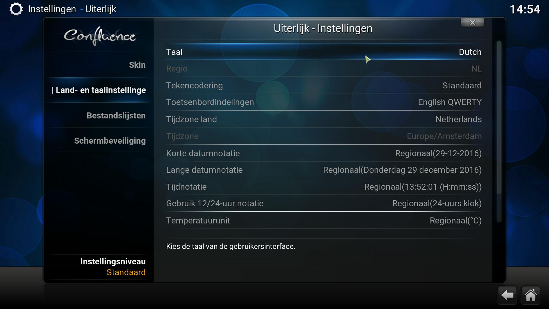 De voertaal binnen LibreELEC is standaard Engels, maar gelukkig wijzig je dat eenvoudig naar het Nederlands. Navigeer achtereenvolgens naar SYSTEM / Settings / Appearance / International. Kies daarna voor Language waarbij je Dutch als standaardtaal instelt. LibreELEC haalt het taalbestand binnen en wijzigt op eigen houtje de interface naar het Nederlands. Verder is het raadzaam om een tijdzone in te stellen, zodat het besturingssysteem het juiste tijdstip weergeeft. Ga links naar Land- en taalinstellingen en kies bij Tijdzone land voor Netherlands.