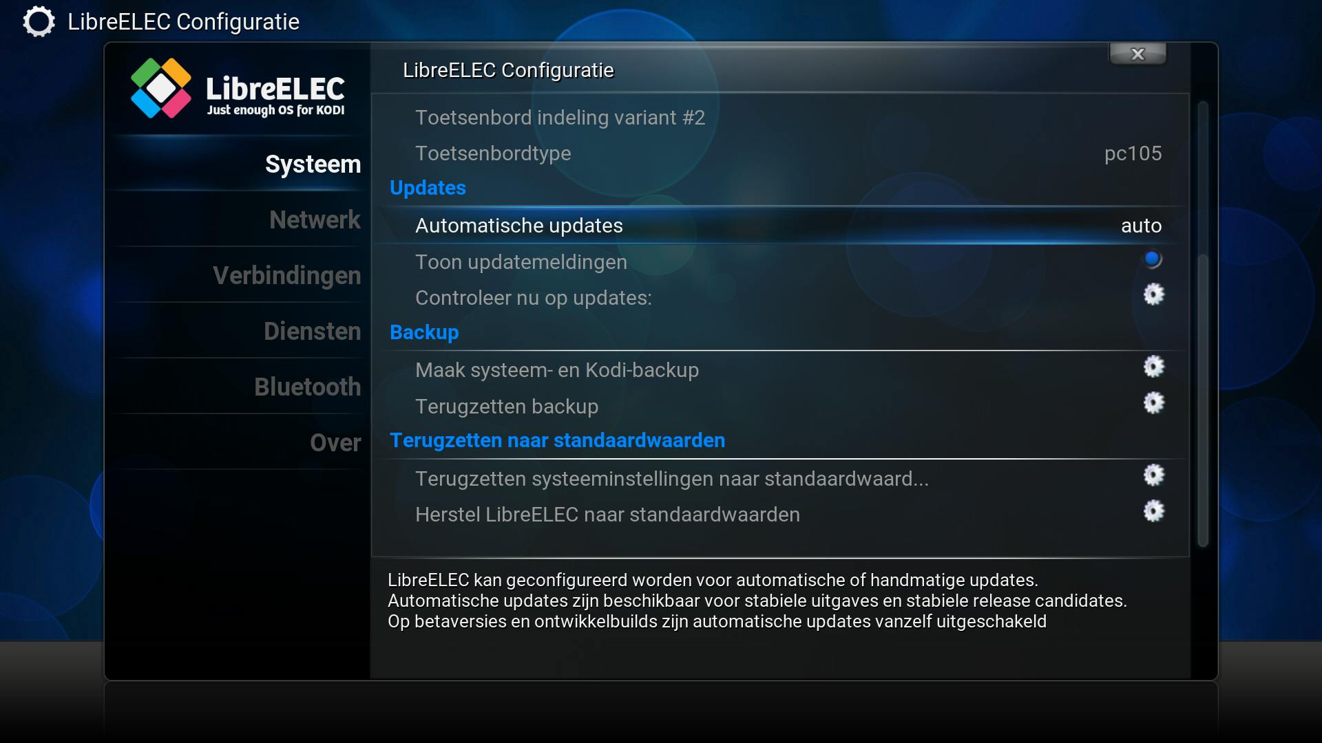 Het is belangrijk om LibreELEC up-to-date te houden. Je hebt dan altijd toegang tot een recente editie van Kodi met eventuele nieuwe functies. De makers stellen regelmatig een nieuwe versie van het besturingssysteem beschikbaar. Blader vanuit het hoofdvenster van Kodi naar SYSTEEM / LibreELEC / Systeem. Bij het onderdeel Updates neem je de mogelijkheden door. De optie Automatische updates staat standaard op manual. Wanneer je updates liever automatisch installeert, kies je hier voor auto. LibreELEC haalt met deze instelling alleen stabiele updates binnen, dus je krijgt niet te maken met bètaversies. Via Controleer nu op updates zie je meteen of er toevallig al een nieuwe versie klaarstaat.
