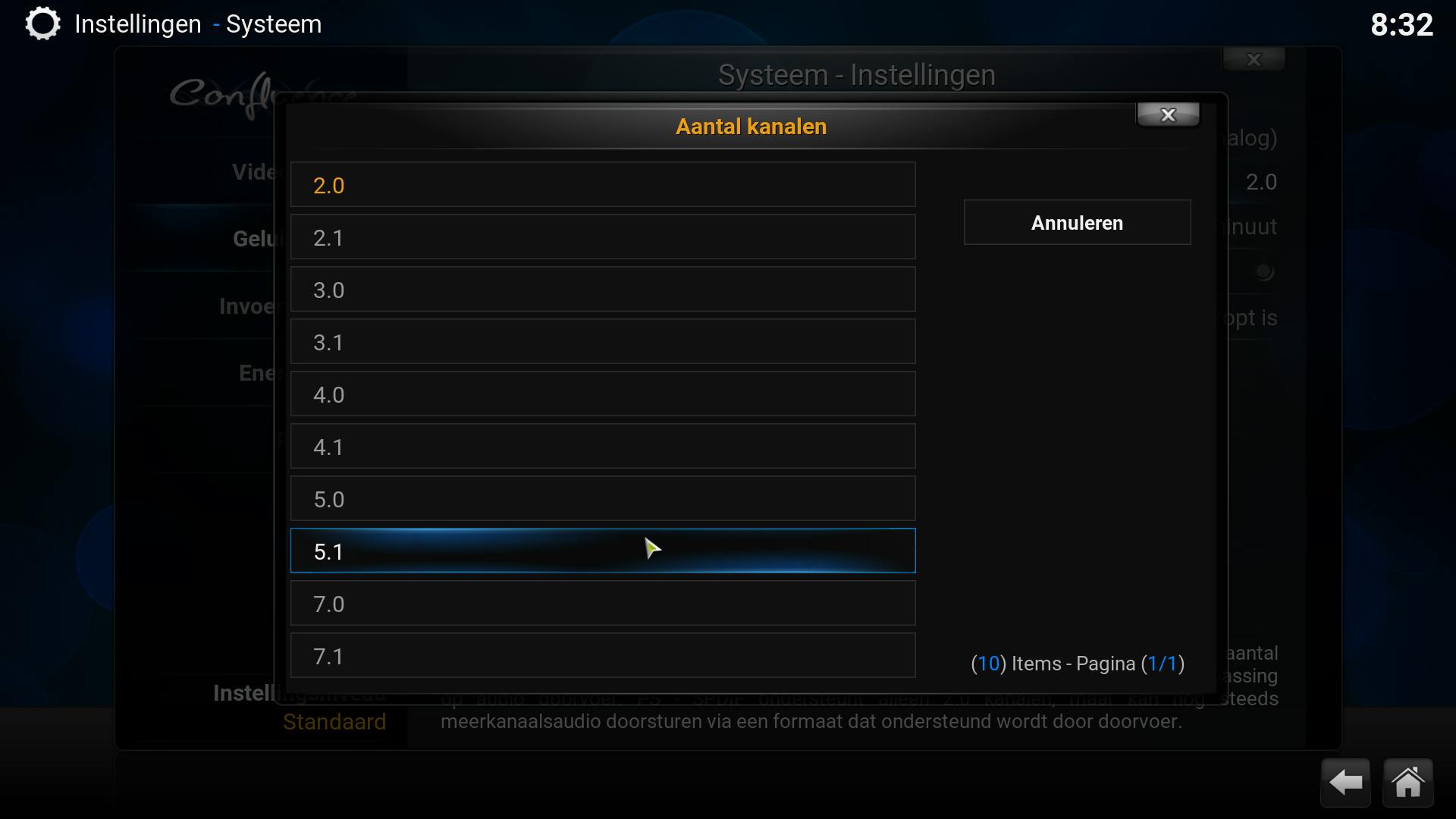 We blijven nog even in de systeeminstellingen, want je wilt natuurlijk genieten van fatsoenlijk geluid. Kies links voor Geluidsuitgang en open de optie Apparaat voor geluidsuitvoer. Je bepaalt hier via welke verbinding je mediaspeler audio afspeelt. Wanneer je de mediaspeler via hdmi hebt aangesloten op een receiver, kies je hier de naam van dit audioapparaat. Via Aantal kanalen geef je aan dat je bijvoorbeeld via een 5.1kanaals-audiosysteem geluid wilt afspelen.