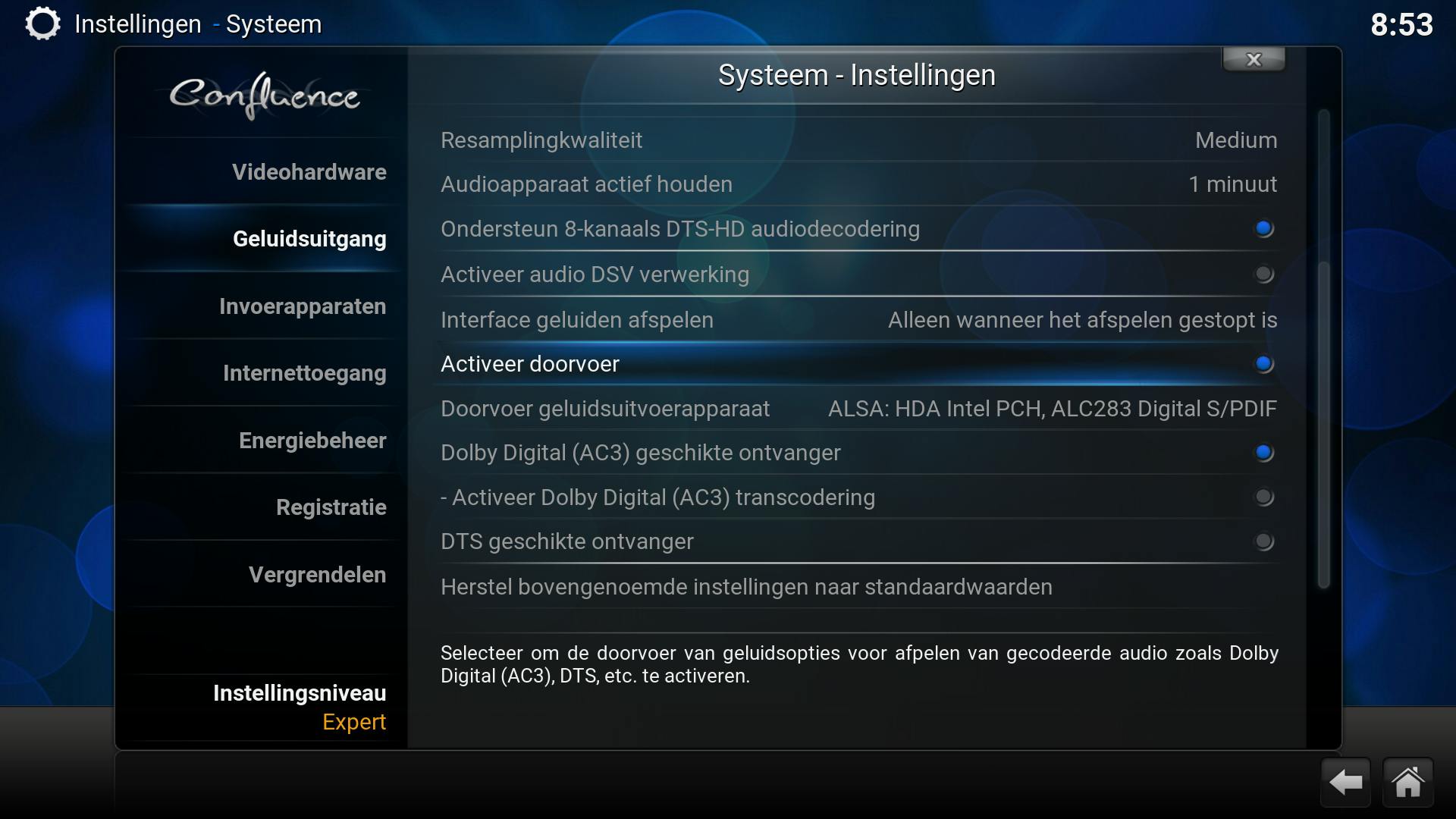 Alle moderne receivers zijn in staat om zelfstandig bekende surroundformaten te decoderen, zoals dts(-hd) en dolby digital. Vanuit Kodi dien je het geluidsspoor om die reden ongecodeerd door te sturen, waarna je receiver vervolgens de geluidsverwerking afhandelt. Standaard is deze optie binnen de instellingen van Kodi onzichtbaar. We gaan ervan uit dat je nog steeds het menuonderdeel Geluidsuitgang uit de vorige stap hebt geopend. Klik linksonder tweemaal op Instellingenniveau om de expertinstellingen te tonen. Scrol zo nodig een stukje omlaag en markeer de optie Activeer doorvoer. Neem de opties door en bepaal of je dts, dts-hd en/of dolby digital wilt doorvoeren.