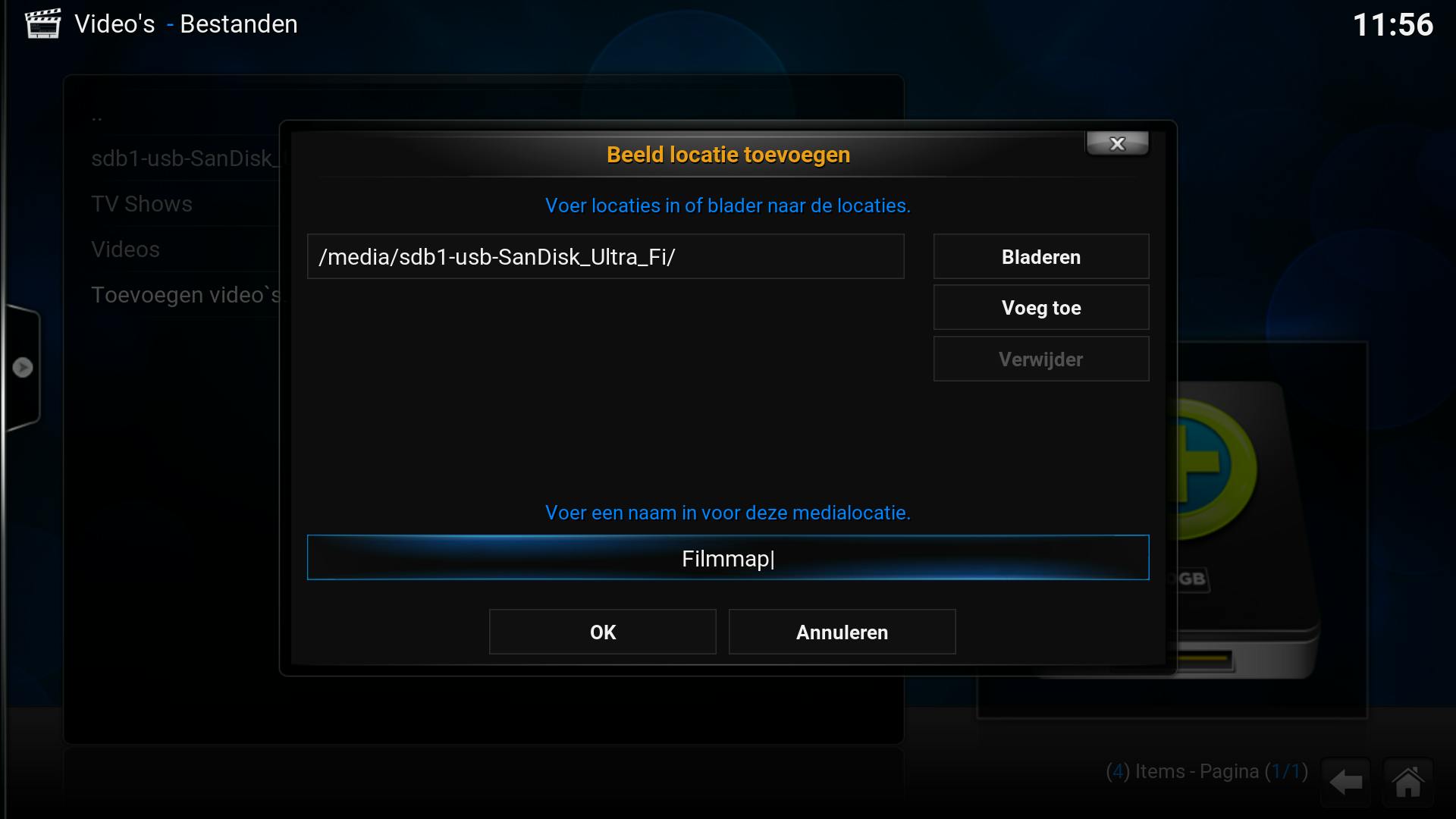 Voordat je films en series gaat afspelen, geef je eerst aan met welke mappen je een mediabibliotheek wilt opbouwen. De eenvoudigste optie is om films, series en muziek via lokale opslagmedia af te spelen. Sluit bijvoorbeeld een externe schijf, usb-stick of sd-kaart met mediabestanden op het apparaat aan. Ga naar VIDEO’S / Bestanden / Toevoegen video’s en kies voor Bladeren. Navigeer naar Root bestandssysteem / media en open het juiste schijfstation. Nadat je de goede mediamap hebt gevonden, bevestig je met OK. Onderaan geef je deze locatie een relevante naam, bijvoorbeeld Filmmap. Klik daarna op OK.