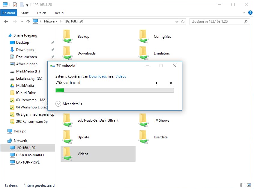 Bevat jouw Kodi-speler een interne schijf? Vanaf iedere Windows-pc vul je deze schijf eenvoudig met mediabestanden. Je hebt hiervoor wel het ip-adres van jouw mediaspeler nodig. Je achterhaalt dat door in Kodi te kiezen voor SYSTEEM / Systeeminformatie. Schrijf de getallenreeks op een briefje en open op je Windows-pc de Verkenner. Je typt in de adresbalk \\ip-adres_mediaspeler\, bijvoorbeeld \\192.168.1.20\. Druk daarna op Enter. Als je pc vraagt naar inloggegevens, vul je tweemaal libreelec in. Alle interne mappen verschijnen netjes op het scherm. Via het netwerk kopieer je nu bijvoorbeeld films naar de map Videos.