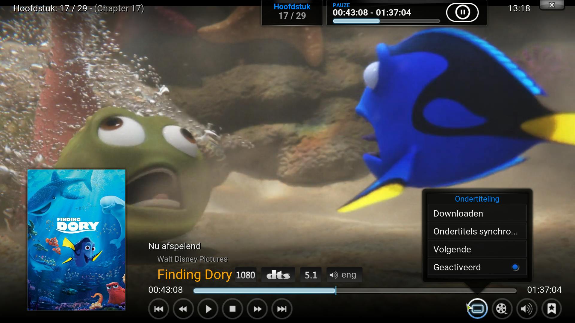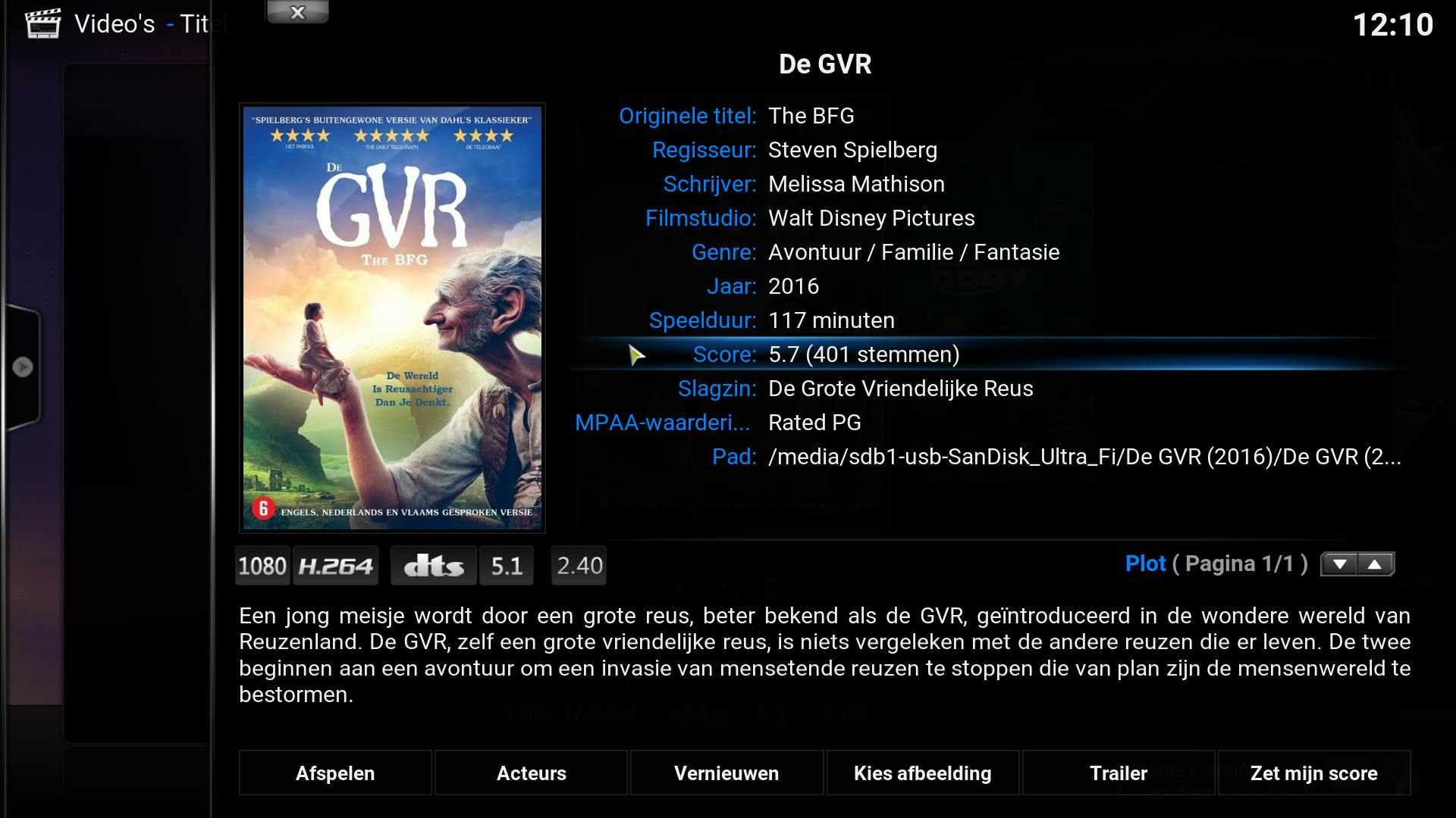 Uiteraard wil je Kodi gebruiken voor het afspelen van films. Kies in het hoofdmenu voor Speelfilms en klik op een titel die je wilt zien. De weergave start direct. Gebruik onderaan de mediaknoppen om bijvoorbeeld hoofdstukken te skippen of te pauzeren. Via het ondertiteling-symbool rechtsonder schakel je ondertitels desgewenst in of uit. Klik zo nodig op het luidsprekertje om het geluidskanaal aan te passen. Op die manier activeer je bijvoorbeeld Nederlandse stemmen en/of dts-surroundgeluid.