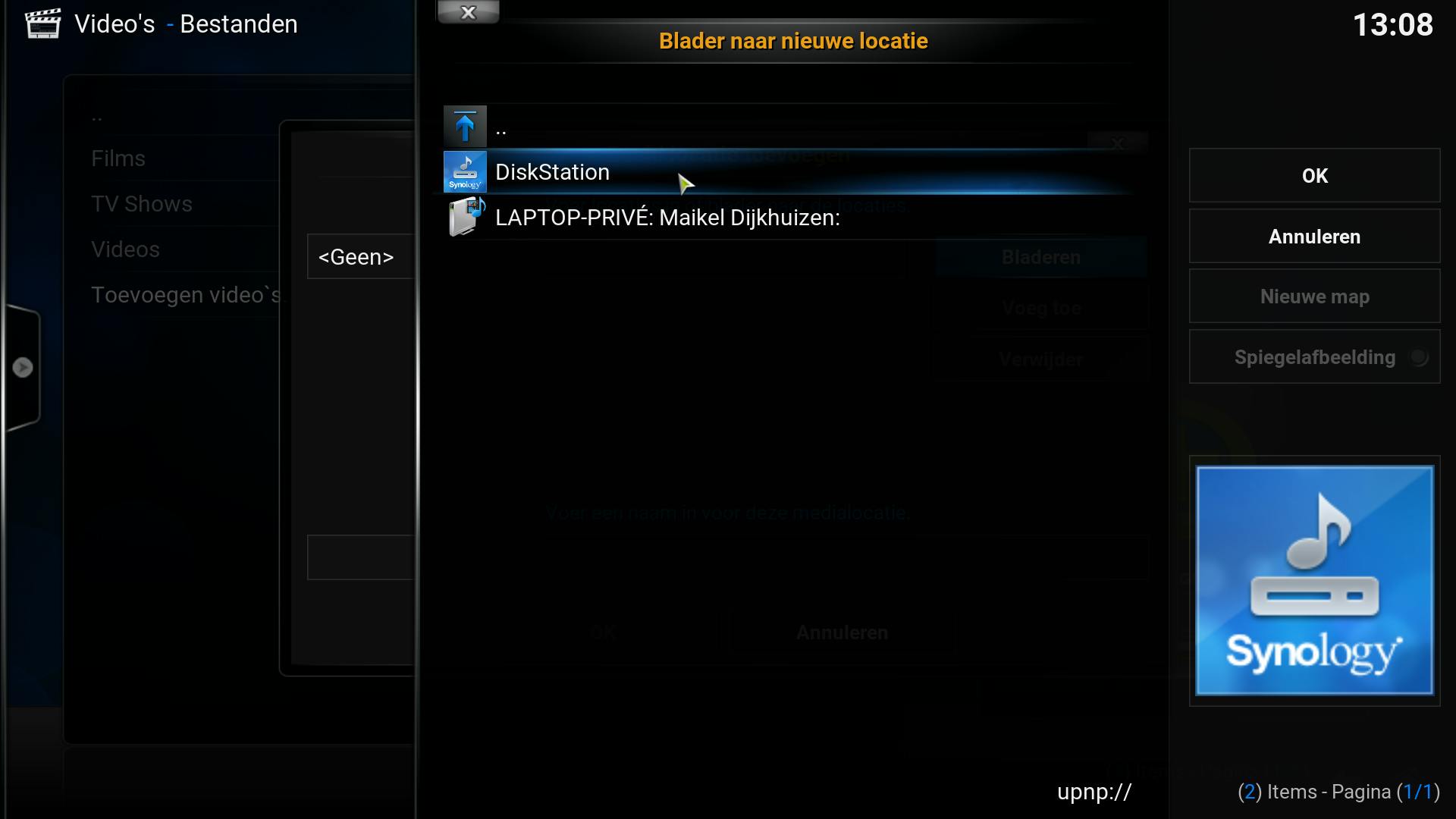 Kodi is ook in staat om netwerkbronnen te benaderen, zoals een pc of nas. Deze functie is bruikbaar als alle mediabestanden op een centrale mediaserver in je thuisnetwerk staan opgeslagen. Kodi herkent eenvoudig upnp/dlna-mediaservers in je netwerk. Blader vanuit het hoofdmenu naar VIDEO’S / Bestanden / Toevoegen video’s. Via Bladeren kies je voor UPnP apparaten. Klik op de netwerkbron waarbij de mediabestanden staan opgeslagen en voeg hiervan de juiste map toe. Bevestig als laatste met OK.