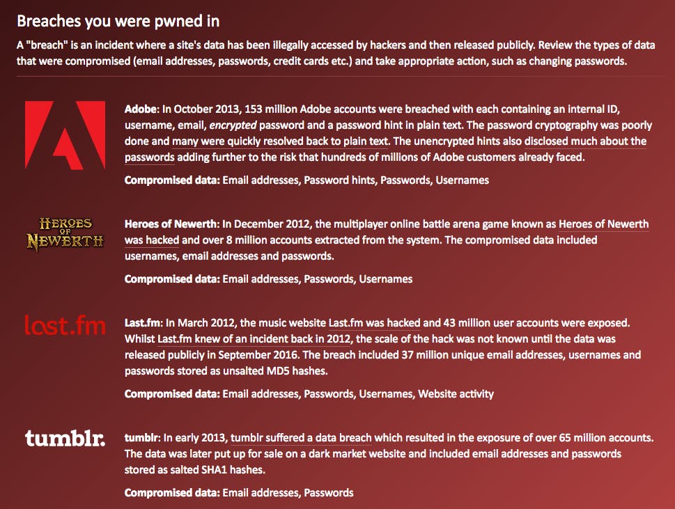 Heb je veel accounts, dan heb je ook nog de kans dat je persoonlijke gegevens in verkeerde handen vallen. Sommige sites zijn amateuristisch beveiligd waardoor de gegevens eigenlijk te grabbel liggen. Maar ook grote namen met betere beveiliging worden gehackt met alle gevolgen van dien. Zo lekten er de afgelopen jaren honderden miljoenen inloggegevens uit, onder andere van LinkedIn, Dropbox, Yahoo, Adobe, Avast, Snapchat en Last.fm. Dergelijke gegevens zijn goud waard en worden voor veel geld doorverkocht aan verschillende partijen. Wat het gevaar daarvan is, lees je hierna.