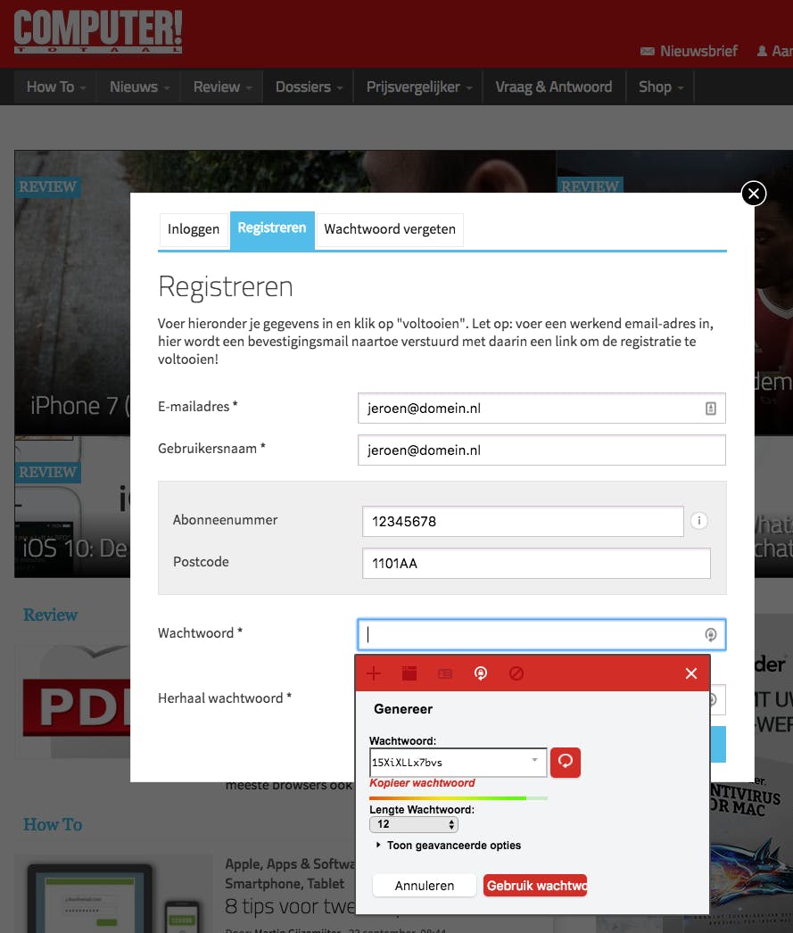 Veel mensen gebruiken te korte en eenvoudige wachtwoorden, en dan ook nog hetzelfde wachtwoord voor meerdere sites. Wordt één van deze sites gehackt, dan zijn alle profielen ineens kwetsbaar. Veel ingewikkelde wachtwoorden onthouden lukt vrijwel niemand, gebruik daarom een wachtwoordmanager. Dat kan in de vorm van een programma, app, browserplug-in of website. Denk bijvoorbeeld aan LastPass, KeePass en 1Password. Deze zijn beschikbaar voor vrijwel alle smartphones en computers en ze nemen het probleem met complexe wachtwoorden geheel uit handen. Je registreert je eenmalig bij zo’n dienst en stelt dan één wachtwoord in. Vervolgens onthoudt de dienst alle inloggegevens van de sites waarbij je inlogt. De tools kunnen ook helpen bij het wijzigen van je wachtwoord of het registreren bij een nieuwe site. Er wordt dan automatisch een complex wachtwoord aangemaakt die alleen voor die site geldt. De complexiteit, zoals het aantal tekens, hoofdletter- en cijfergebruik en vreemde tekens, is in te stellen. Je hoeft dat wachtwoord zelf niet te onthouden, dat doet de wachtwoordmanager voor je. Sommige wachtwoordmanagers hebben een optie om een mailadres van een contactpersoon toe te voegen, zodat die persoon in een noodgeval toegang heeft.