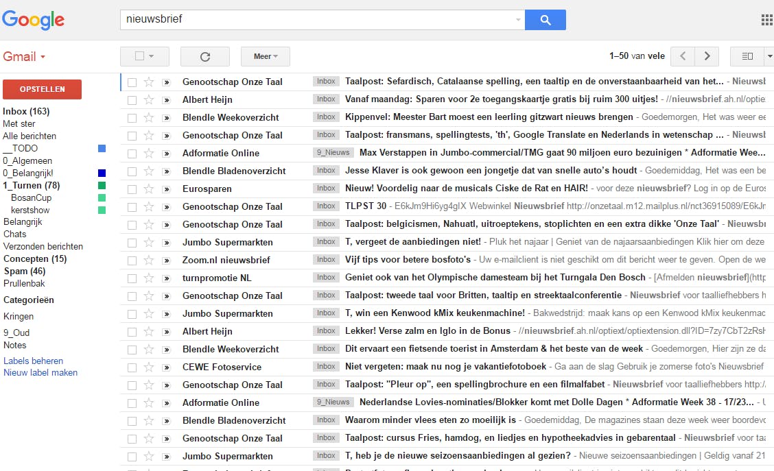 Je hebt waarschijnlijk meer online accounts dan je denkt. Dat komt mede doordat vrijwel iedere webshop tegenwoordig het aanmaken van een account verplicht of stimuleert. Als je ergens eenmalig iets koopt, is dat onnodig en zelfs onwenselijk. Je e-mailadres, wachtwoord, adresgegevens en wat je gekocht hebt, staan dan immers ergens in een database – misschien wel voor eeuwig. Iedereen kan tegenwoordig met drie klikken een webshop beginnen, maar lang niet iedereen heeft de beveiliging goed op orde. Bovendien werkt dit ongevraagde mail in de hand, zelfs als je hebt aangegeven geen nieuwsbrief te willen ontvangen. Een makkelijke manier om te ontdekken bij welke webshops je zoal accounts hebt, is door te zoeken in je mail – bijvoorbeeld naar bestelling of factuur. Doe hetzelfde vervolgens nieuwsbrieven door op nieuwsbrief te zoeken. Vergeet ook niet in je spammap te kijken. Zoeken naar registratie en account helpt om accounts op fora en andere sites te traceren. En bekijk ook de (oude) bladwijzers van je webbrowser. En googel jezelf eens door je volledige naam, je e-mailadres en eventuele nicknames als zoektermen te gebruiken.