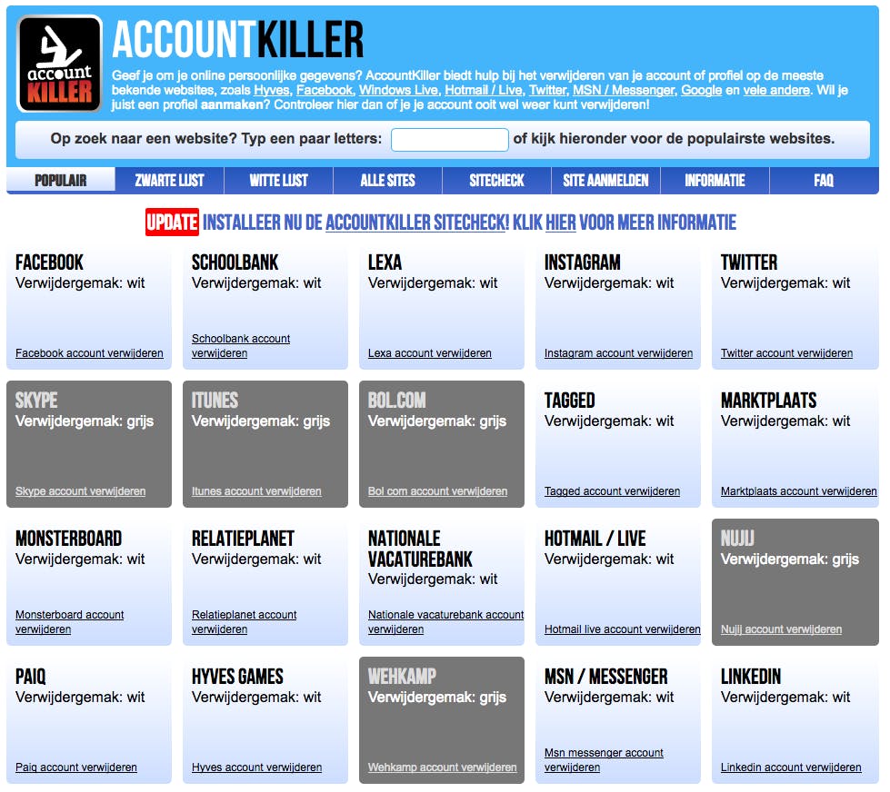 Accounts vinden is één ding, ze opheffen is vaak niet zo makkelijk. Veel sites hebben daar geen optie voor of deze zit ergens verstopt. Soms kun je zelf je account verwijderen en anders kun je de betreffende site mailen met het verzoek om je persoonsgegevens inclusief historie te verwijderen. In principe moet een site daar wettelijk gezien gehoor aan geven, mits de gegevens niet meer nodig zijn (een webshop moet immers wel een administratie bijhouden). Wanneer de garantieperiode van een product dat je bij een webshop besteld hebt verstreken is, is er geen noodzaak meer om je gegevens te bewaren. Als het om een grote publieke site gaat, zoals Facebook, Hotmail of Monsterboard, dan is er meestal een manier om je account te verwijderen. Met een site als www.accountkiller.com kun je makkelijk regelen, hierop staan namelijk directe links naar de pagina’s waar je dit kunt doen. Geheel los daarvan is het sterk aan te raden om zelf al bepaalde data te verwijderen als dat kan. Denk aan foto’s, berichten en profielgegevens. Veel sites claimen alle gegevens te wissen, maar in de praktijk is dat vaak niet het geval en blijven dergelijke zaken op de server staan (een account wordt dan bijvoorbeeld gedeactiveerd, maar niet echt verwijderd). Houd er ook rekening mee dat gegevens nog een tijdje in de Google-cache te vinden zullen zijn.