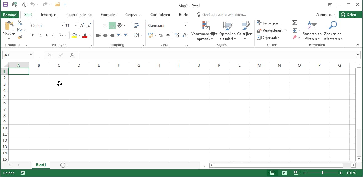Als je Excel start, opent het start-of welkomstscherm. Je kunt met een van de ingebouwde sjablonen beginnen, maar in deze cursus kiezen we voor een blanco werkmap. Klik hiertoe op Lege werkmap boven in het startscherm. Het nieuwe, lege bestand wordt in Excel standaard Map1 genoemd; deze naam staat in de titelbalk boven in het venster.