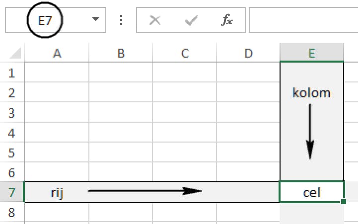 Cellen die onder elkaar staan vormen een kolom. In Excel wordt iedere kolom aangeduid met de letter die erboven staat. In de afbeelding is kolom E gemarkeerd. Een reeks cellen naast elkaar over de volle breedte heet een rij. Iedere rij heeft een nummer aan de linkerkant. In de afbeelding is rij 7 gemarkeerd. Iedere cel wordt aangeduid met een letter en een cijfer, zoals de vakken op een landkaart of van een schaakbord. Cel E7 bijvoorbeeld staat dus in kolom E, rij 7. De aanduiding E7 noem je het adres van de cel. Klik je op een cel, dan wordt de omtrek van die cel dik en donkergroen en de kolomletter en het rijnummer krijgen een kleuraccent. Het adres van die cel vind je terug in het vak linksboven (het zogeheten Naamvak).