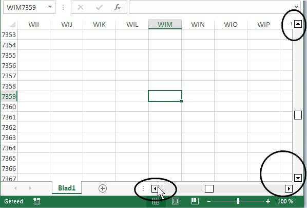 Wanneer je een nieuw werkblad opent, is cel A1 standaard geselecteerd en kun je deze bewerken. Wil je een andere cel bewerken, dan kun je daarnaartoe met de navigatietoetsen op je toetsenbord of door met de linkermuisknop te klikken op de cel die je wilt gebruiken. Wil je verder naar rechts in het werkblad dan wat er zichtbaar is, versleep dan het blokje van de horizontale schuifbalk onder in beeld, of druk op het pijltje naar rechts (op je toetsenbord); het werkblad schuift dan automatisch op. Voor omlaag geldt hetzelfde, maar logischerwijs gebruik je dan het pijltje naar beneden. In verticale richting kun je ook nog gebruikmaken van de scrolfunctie van je muis (met geavanceerde muizen soms trouwens ook in horizontale richting).