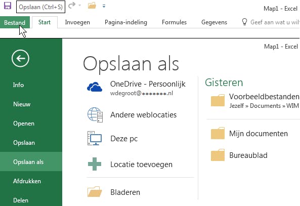 Heb je gegevens of formules in het werkblad gezet, dan kun je het bestand opslaan. Je kunt er dan altijd later nog verder aan werken. Klik op Bestand / Opslaan. Of druk op de sneltoets Ctrl+S. Er verschijnt een venster met opties waar je je werkmap kunt opslaan. In ieder geval staat er Deze pc. Mogelijk staat er ook OneDrive bij, als je bij Microsoft bent aangemeld. In dit voorbeeld kiezen we voor Deze pc om het bestand op te slaan op de harde schijf. Je kunt ook voor Bladeren kiezen en navigeren naar een bepaalde map op je pc, aangesloten usb-stick, netwerk en dergelijke. Wil je vanuit Excel sneller je bestand opslaan naar een zelf te kiezen locatie? Gebruik dan F12. Hiermee open je direct het Opslaan als-venster.