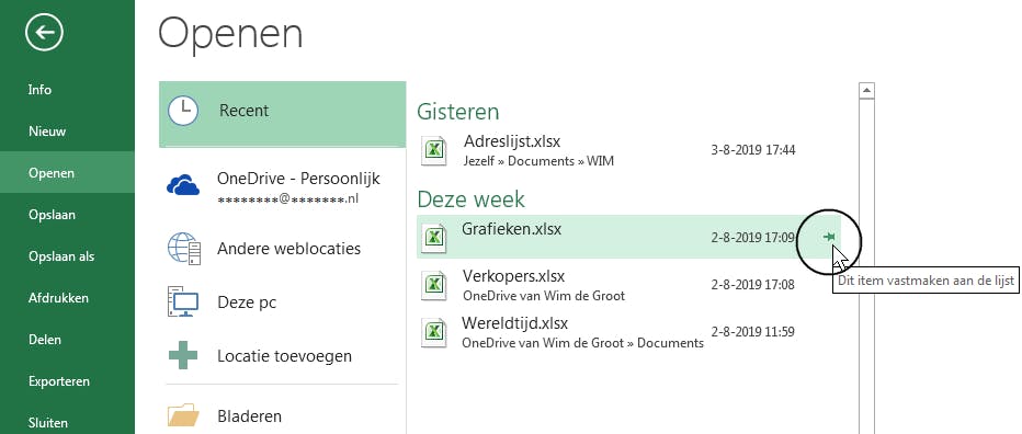 Het venster Openen toont onder andere de optie Recent. Dat bevat een lijst met bestanden die je de laatste tijd hebt geopend. Staat je bestand hiertussen, dan hoef je niet verder te zoeken in de mappen op je pc. Handig is dat je een bestand aan deze lijst vast kunt maken zodat het altijd bovenaan blijft staan. Klik hiervoor op de punaise rechts naast de bestandsnaam.