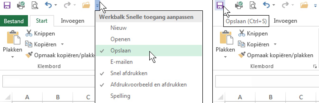 Het is een goede gewoonte om de werkmap waar je aan werkt regelmatig op te slaan. Mocht je pc of Excel namelijk onverhoopt vastlopen of zou de stroom een keer uitvallen, dan heb je wellicht urenlang voor niets gewerkt. Voeg hiervoor eerst de knop Opslaan toe aan de werkbalk Snelle toegang (dit is de balk helemaal boven aan je venster). Klik op het pijltje rechts naast de werkbalk Snelle toegang; er opent een menu waar je de optie Opslaan aan kunt vinken. Je werk kun je vervolgens regelmatig opslaan door op die knop te klikken of, als je liever gewoon met het toetsenbord werkt, op Ctrl+S. Heb je belangrijke informatie toegevoegd, een groot aantal gegevens ingevoerd of een formule opgesteld, wen jezelf dan aan om tussendoor even snel op Opslaan te klikken of op Ctrl+S te drukken.