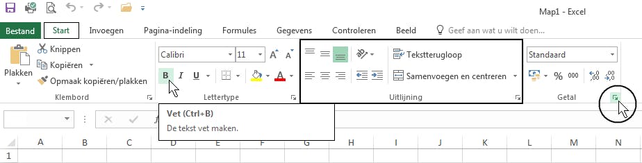 Met de brede band boven aan het venster (het lint) bedien je Excel. Het lint bevat een aantal tabbladen. Als je op zo’n tab klikt, krijg je een flink aantal knoppen te zien. De knoppen in het lint zijn compact of groot, dat hangt af van de breedte van je beeldscherm. De knoppen zijn in groepen ondergebracht. In enkele groepen staat rechtsonder een diagonaal pijltje. Daarmee open je een nieuw venster met meer mogelijkheden.