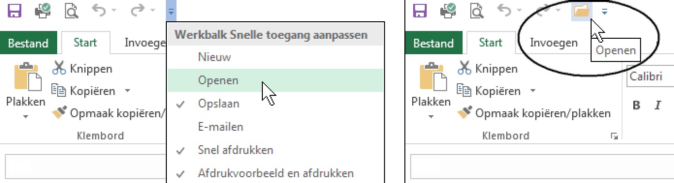 We schreven al eerder over de werkbalk Snelle toegang, die zich boven het lint bevindt. Je ziet daar de knoppen Opslaan, Ongedaan maken en Opnieuw al staan. Maar deze werkbalk kun je aanpassen. Om bijvoorbeeld de knop Openen toe te voegen aan de werkbalk Snelle toegang, onderneem je de volgende stappen: