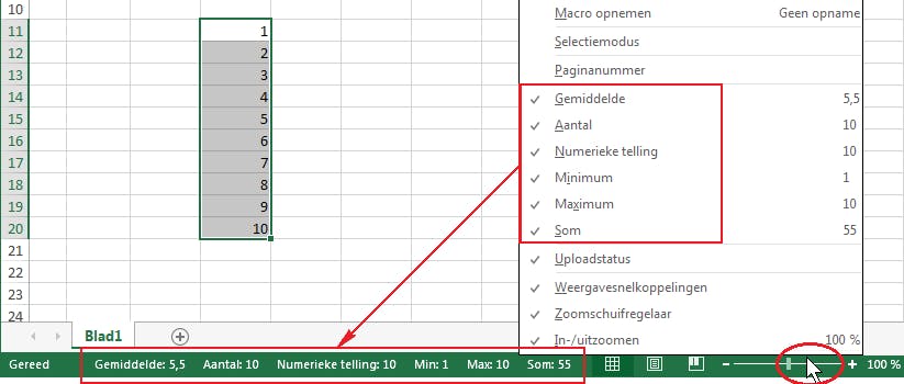 Helemaal onderaan bevindt zich de statusbalk. Die gebruik je om het beeld in te stellen en om informatie die in cellen staat te bekijken. Klik met de rechtermuisknop op de statusbalk om een menu te openen. Schakel in ieder geval de serie Gemiddelde tot en met Som in. Daarmee kun je snel het gemiddelde, de som enzovoort van een groep cellen aflezen zonder er een formule op los te hoeven laten. Selecteer een aantal cellen en je ziet in de statusbalk meteen het resultaat.