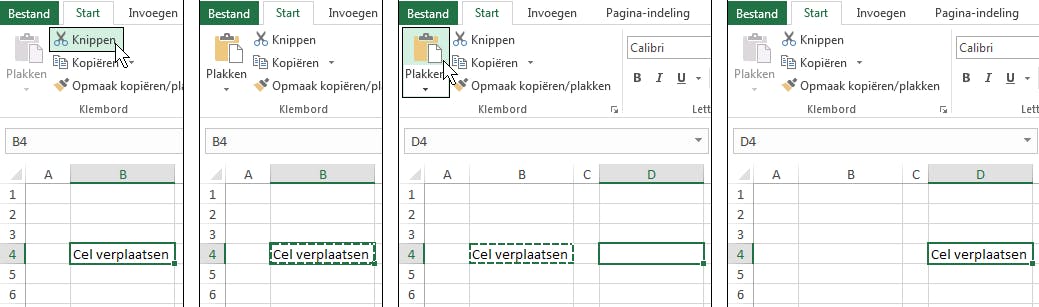 Zo kun je ook een groep cellen verplaatsen. Stel dat je de cellen B2 tot en met D4 vier cellen naar rechts en één cel omlaag wilt verplaatsen: