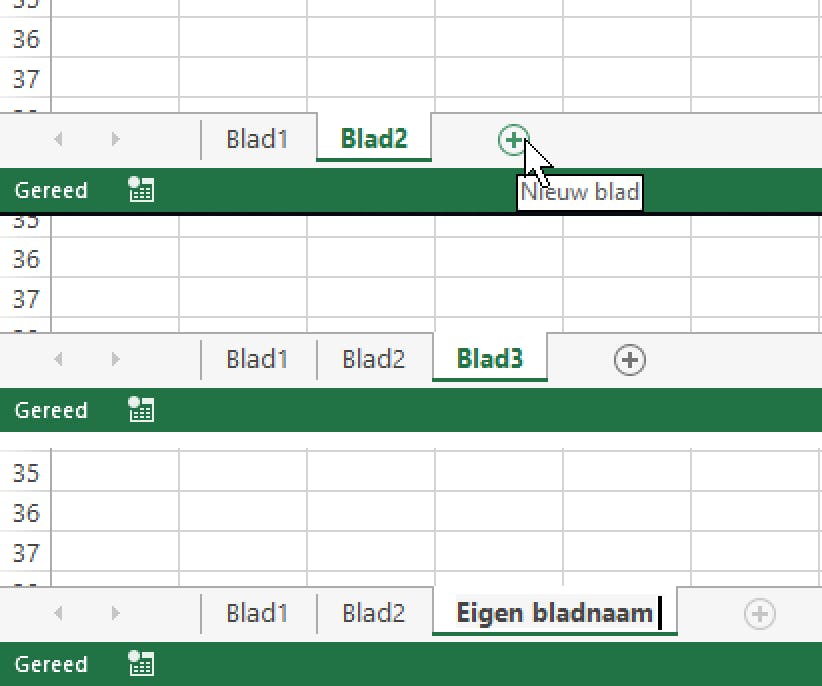 Ieder werkblad in Excel krijgt een eigen naam. Deze lees je af onderaan, op de regel boven de statusbalk. De werkbladen van een nieuwe werkmap heten Blad1 en – afhankelijk van de versie van Excel – nog twee extra werkbladen, Blad2 en Blad3. De tab van het werkblad waarop je aan het werk bent, is wit en die naam is groen en vet. Je gaat naar een ander werkblad door te klikken op de tab van het gewenste werkblad, bijvoorbeeld Blad2 of Blad3.