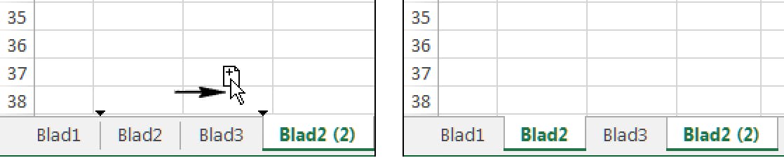1. Houd de Ctrl-toets ingedrukt en klik op de bladtab; bij de muisaanwijzer verschijnen weer dezelfde tekentjes als wanneer je een tabblad wilt verplaatsen.