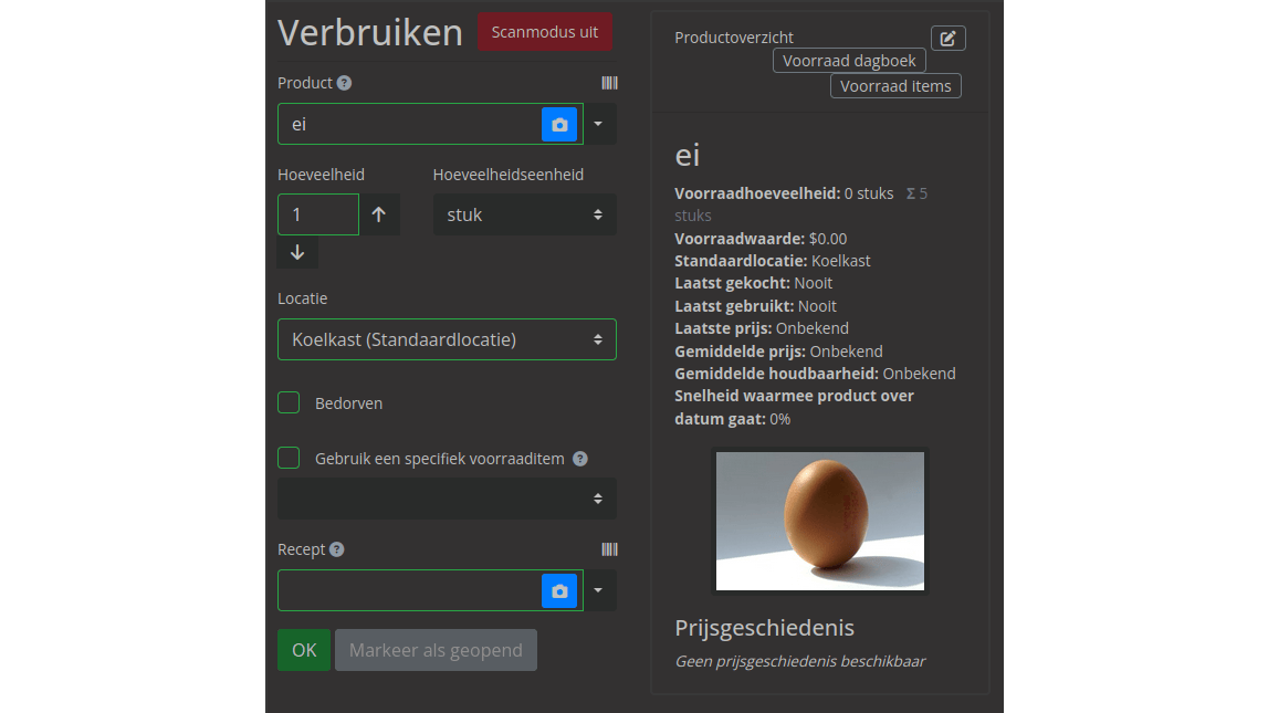 Wanneer je een product verbruikt, past Grocy je voorraad aan.