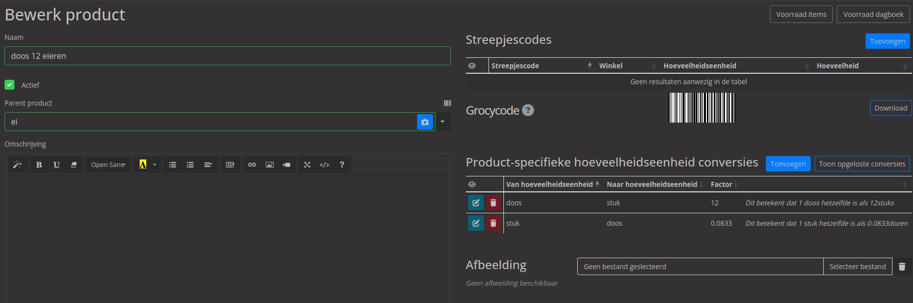 Als je dit product opslaat, kun je onder de streepjescode ook hoeveelheidseenheid-conversies instellen voor dit product, waarin je dan instelt dat een doos uit zes stuks bestaat. En als je dan bij ei hebt gedefinieerd dat je altijd zes eieren wilt hebben en dan een doos van twaalf koopt en er zeven uit verbruikt, wordt er in je voorraad getoond dat je nog vijf eieren hebt en je de voorraad moet aanvullen.