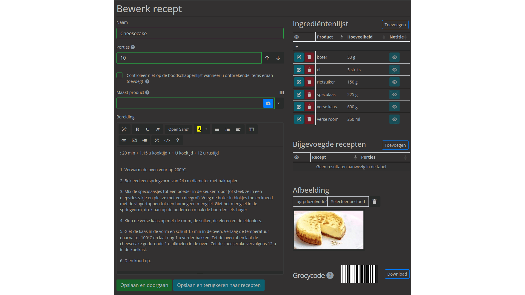 Het is ook mogelijk om recepten aan Grocy toe te voegen. Je geeft het recept een naam en vult het aantal porties in. Beschrijf de bereiding in het tekstveld en klik dan op Opslaan en doorgaan. Voeg daarna één voor één de benodigde ingrediënten toe.