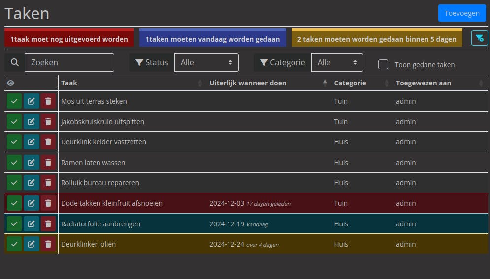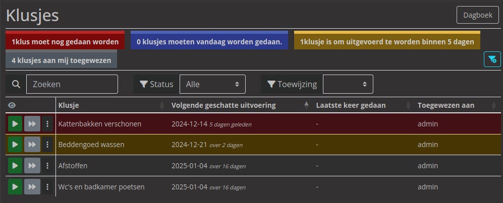 Een gekleurde achtergrond wijst erop met welke klusjes je te laat bent, welke er vandaag moeten gebeuren en welke er binnen de vijf dagen moeten worden gedaan. Wanneer je een klusje hebt gedaan, klik je op het groene icoontje om het als gedaan te markeren of op het grijze icoontje om het deze keer over te slaan. Met een klik op de drie puntjes kun je ook een klusje op een andere datum opnieuw inplannen of een klusjesdagboek bekijken.
