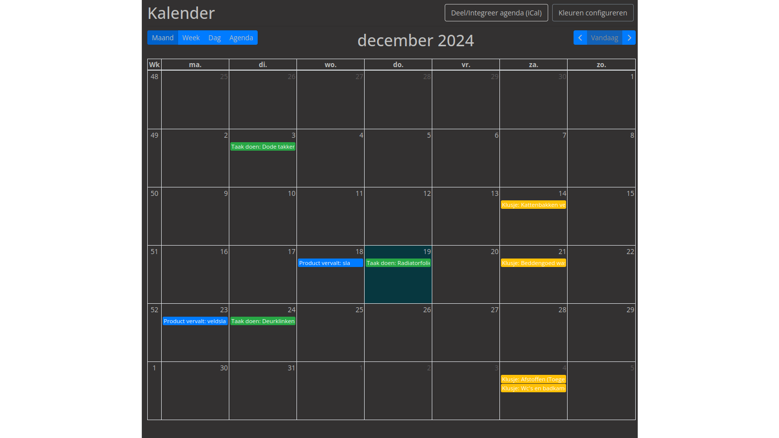 Met een klik op de gebeurtenis in de kalender ga je door naar de desbetreffende Grocy-pagina. Je kunt deze kalender ook delen door middel van een url in iCal-formaat, maar dan moet je wel zorgen dat de gebruiker of het programma waarmee je dit deelt toegang tot je Grocy-installatie heeft zonder authenticatie.