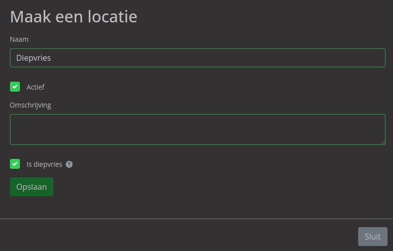 Voordat je de virtuele voorraad kunt vullen, is het nodig om een aantal basisgegevens in te vullen. Klik hiervoor links op Beheer masterdata. Maar voordat je producten kunt aanmaken, dien je eerst locaties en hoeveelheidseenheden te definiëren. Locaties zijn fysieke locaties in je huis. Dat kunnen kamers zijn (keuken, berging, kelder), maar je kunt het zo specifiek maken als je wilt, bijvoorbeeld voorraadkast, snoepkast of theehoekje. Het is aanbevolen om sowieso locaties aan te maken voor je koelkast en diepvries, omdat de houdbaarheid van producten die hier in- en uitgaan speciale aandacht vereist. Klik dus links op Locaties en dan bovenaan op Toevoegen. Maak zo een voor een de benodigde locaties aan. Vink zeker Is diepvries aan bij je diepvries.