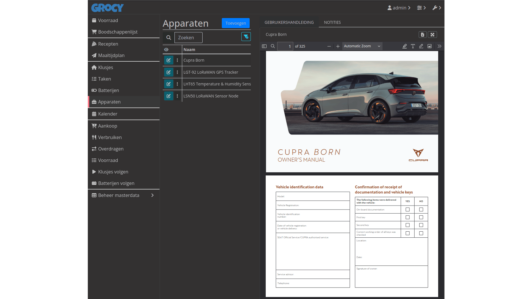 Een laatste functionaliteit die Grocy aanbiedt, vind je onder Apparaten. Hier voeg je een apparaat toe waar je notities bij maakt en een gebruikershandleiding uploadt. Zo heb je altijd de handleidingen van al je apparaten bij de hand. Het pdf-document wordt in de webinterface van Grocy getoond.