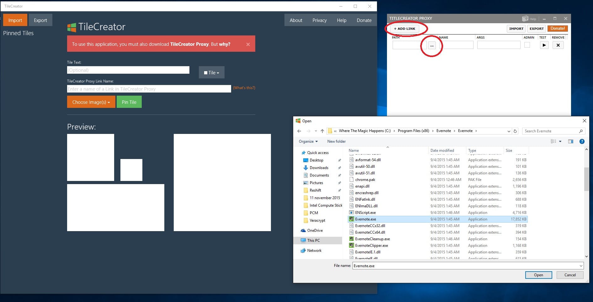 Je begint met TileCreator Proxy (rechts), maar in onderstaand screenshot hebben we de beide programma's alvast naast elkaar geopend. Klik in TileCreator Proxy op 'Add link', zodat er een invulveld verschijnt. Je klikt daar op het blokje met puntjes, zodat de Verkenner wordt opgeopend.