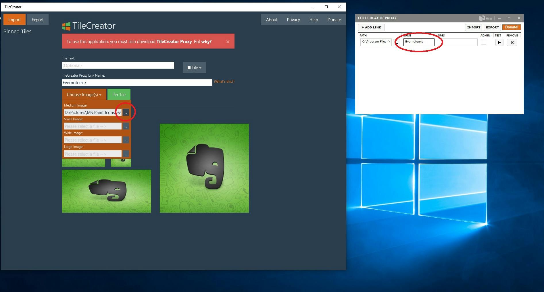 Je ziet dat in het tweede veld ('Name') een bestandsnaam verschijnt - in dit geval Evernoteexe. Kopieer die bestandsnaam, en plak die in het andere programma, TileCreator, onder 'TileCreator Proxy Link Name'.