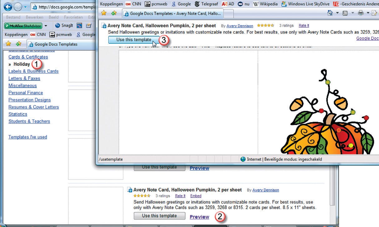 In een nieuw venster staat aan de linkerkant een flink aantal categorieën, in dit geval gaan we voor Holiday (1). Klik op deze link en een aantal voorgebakken templates verschijnt ... althans, in theorie. Helaas blijven de bijbehorende miniatuurweergaven soms wit - hadden we al verteld dat Google Docs zich in een soort van permanente Bètafase bevindt?). Dat is weer op te lossen door op de link Preview (2) te klikken. Mocht het voorbeeld bevallen, dan is een klik op Use this template voldoende. Wij kozen voor een menukaart die netjes is dubbel te vouwen, dan kunnen we hem namelijk op tafel neerzetten. Maak u geen zorgen over de pompoen, die verdwijnt straks.