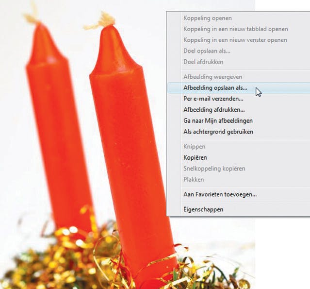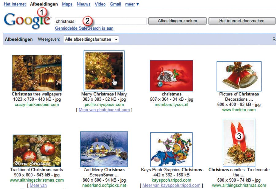 Aangezien u een kerstmenukaart gaat maken, zit u niet te wachten op dit stukje clipart. Klik er met de linkermuisknop op en druk aansluitend op de Deleteknop ...weg pompoen. Ter vervanging opent u een nieuw browservenster en gaat u naar - hoe kan het ook anders - www.google.nl. Klik daar op Afbeeldingen (1) en tik in het zoekveld het woord christmas (geloof ons: met deze Engelse zoekterm vindt u veel meer dan met de Nederlandse!). Kies een liefst staande afbeelding (de menukaart is immers ook staand) en klik op het gewenste plaatje.