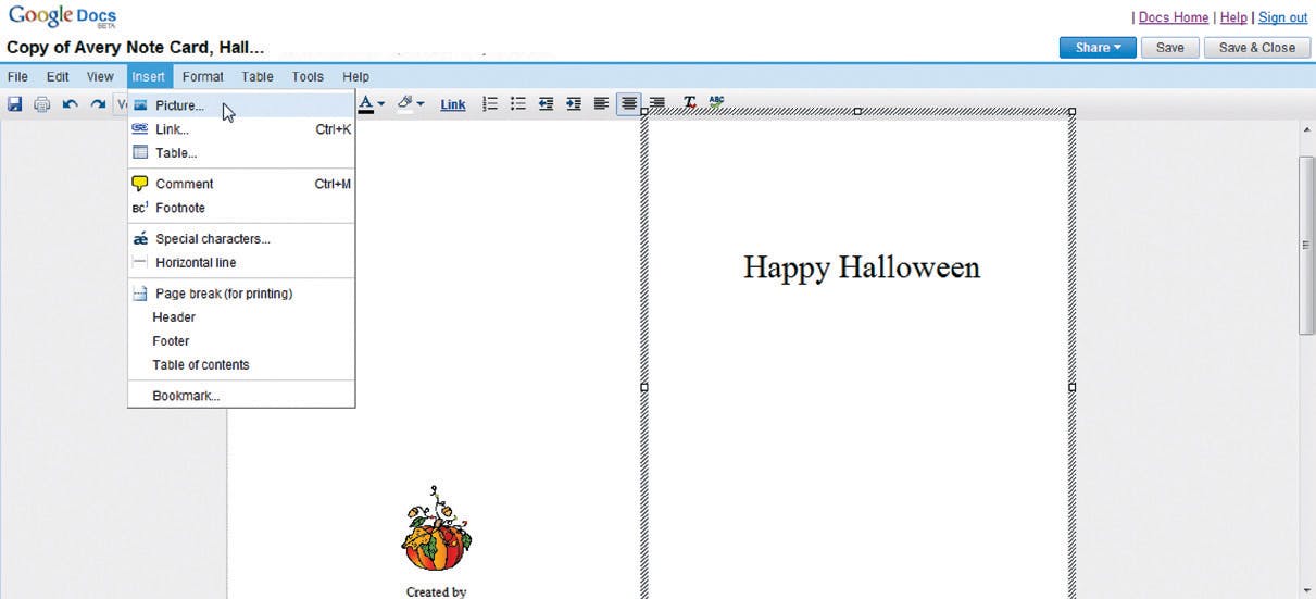 Keer weer terug naar het browservenster met Google Docs met uw lege menukaart. Klik in het menu Insert op Picture.
