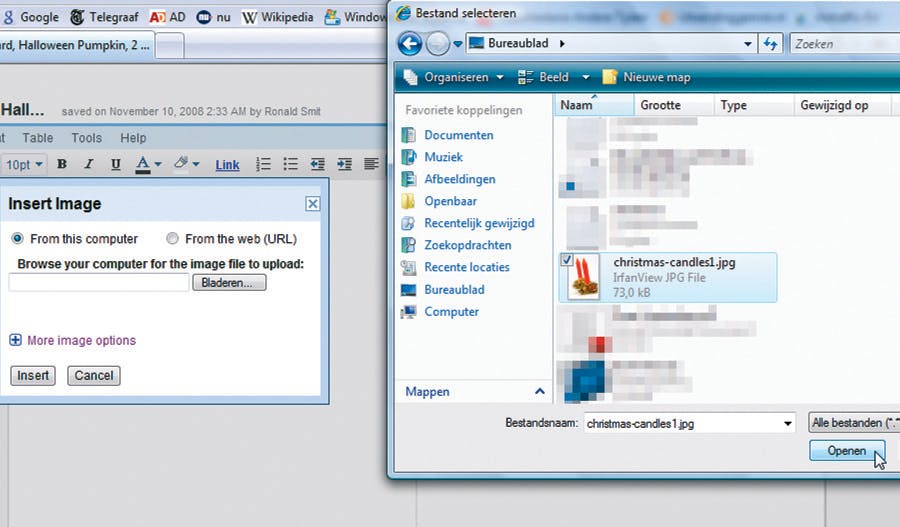 In het nieuwe venster gaat u naar Bladeren (zorg dat de optie From this computer is ingeschakeld) en klik uzelf naar de afbeelding op het Bureaublad. Selecteer deze, klik op Openen en aansluitend op de knop Insert in het venster Insert Image en uw menukaart komt in de juiste kerstsfeer.