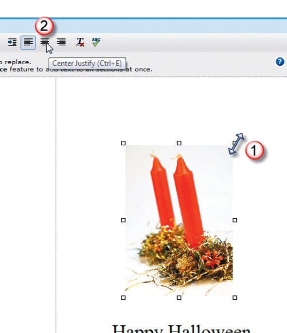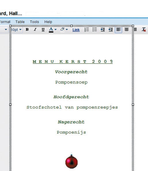 De afbeelding is uiteraard te groot of te klein om netjes te passen. Door het plaatje met de linkermuisknop op een hoekpunt (1) beet te pakken sleept u hem groter of kleiner. Let op! Google Docs houdt geen rekening met de verhoudingen; zitten er veel ronde vormen in het plaatje (kerstballen?) voorkom dan dat dit paaseieren worden. Om de afbeelding netjes in het midden te krijgen, gebruikt u de Centreerknop (2). Vergeet niet de minipompoen op de linkerhelft te vervangen door iets toepasselijks!