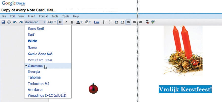 Aan de rechterkant onder de hoofdafbeelding past u de tekst aan naar bijvoorbeeld 'Vrolijk kerstfeest' of iets dergelijks. Er is een (beperkt) aantal lettertypen beschikbaar in Google Docs, kies iets wat u mooi vindt.