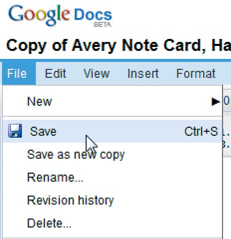 Het sjabloon omvat twee verschillende menukaarten, u kunt er twee verschillende van maken of via het menu Edit, Copy en Paste de inhoud van de ene kaart simpelweg naar de andere kopiëren. Bij dat laatste wordt u gevraagd of Windows Klembord toegang mag hebben tot de geopende webpagina, in dit geval toestaan. Zijn de menukaartjes klaar, dan moet u ze bewaren. Klik daarvoor in het menu File op Save. Google Docs kiest automatisch een bestandsnaam aan de hand van de tekst in het document.
